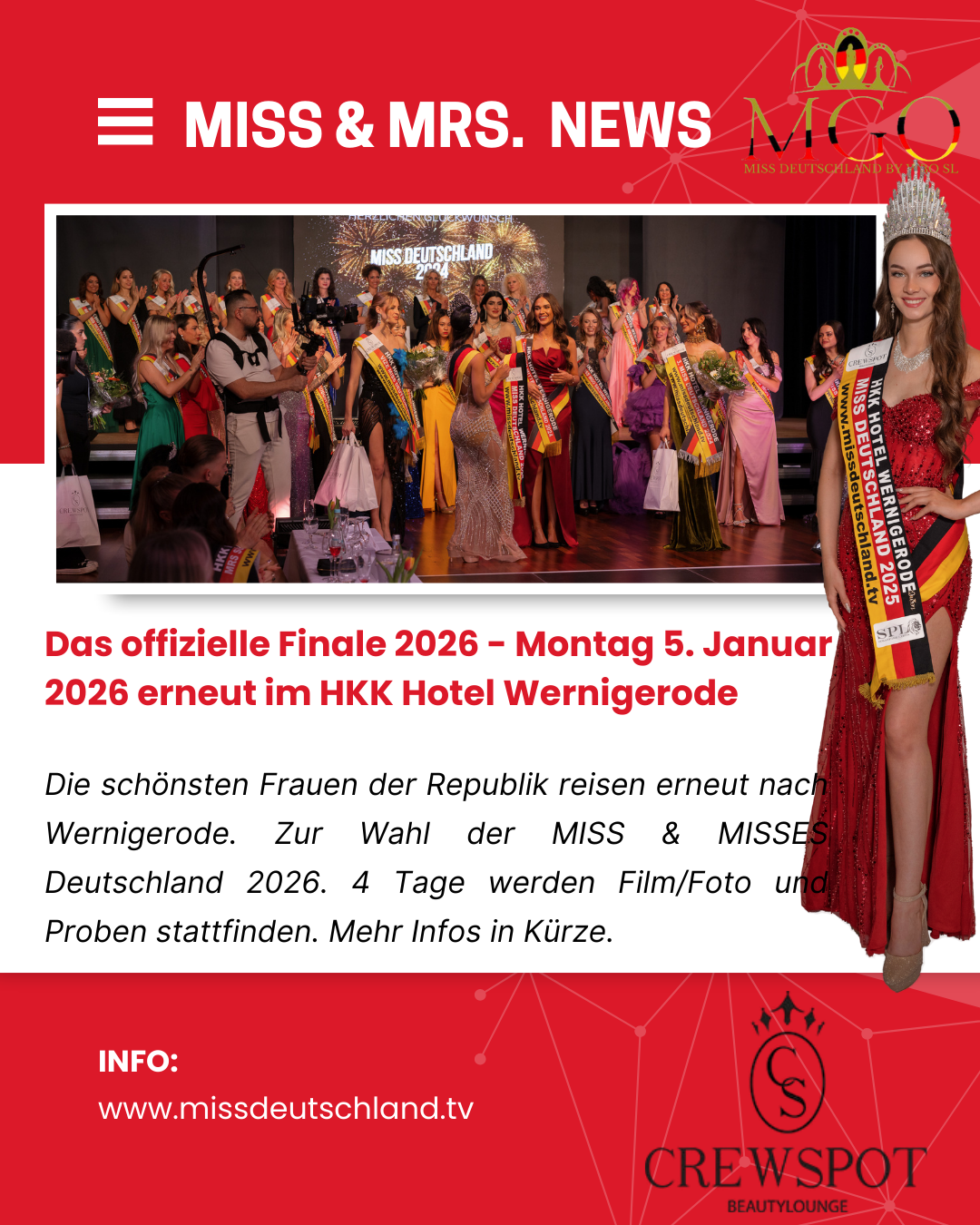Herzlich willkommen in Wernigerode/Sachsen-Anhalt. Das offizielle Bundesfinale der MISS & MRS DEUTSCHLAND Wahl findet nach zwei erfolgreichen Jahren erneut in Wernigerode statt. Zum Zweck des Livestreams und der TV Berichterstattung diesmal am Dienstag, 6.1.2026 und erneut im HKK Hotel in Wernigerode in Sachsen-Anhalt.